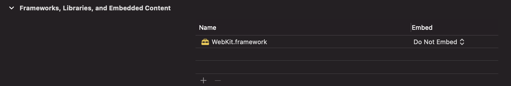 2. 프로젝트의 타깃 설정에서 WebKit.framework를 추가합니다.